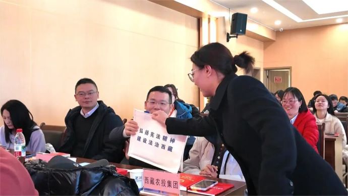 活動(dòng)現(xiàn)場,一系列內(nèi)容豐富、形式新穎的環(huán)節(jié)有序開展。參會(huì)人員集中觀看了憲法精神主題影片及“憲法進(jìn)企業(yè)”主題紀(jì)錄片,直觀感受憲法的崇高權(quán)威與實(shí)踐力量;活動(dòng)特邀西藏歐珠律師事務(wù)所律師歐珠永青作《憲法》專題講座,深入淺出解讀憲法核心要義與依法治企實(shí)踐路徑,充分闡釋了新時(shí)代《憲法》的新發(fā)展,引發(fā)廣泛共鳴;憲法趣味有獎(jiǎng)問答互動(dòng)環(huán)節(jié)氛圍熱烈,有效調(diào)動(dòng)了干部職工學(xué)法用法的積極性;活動(dòng)還設(shè)置了現(xiàn)場法律咨詢環(huán)節(jié),幫助干部職工解決工作生活中遇到的法律問題,號(hào)召大家爭做“學(xué)法先鋒、守法模范、用法表率”。